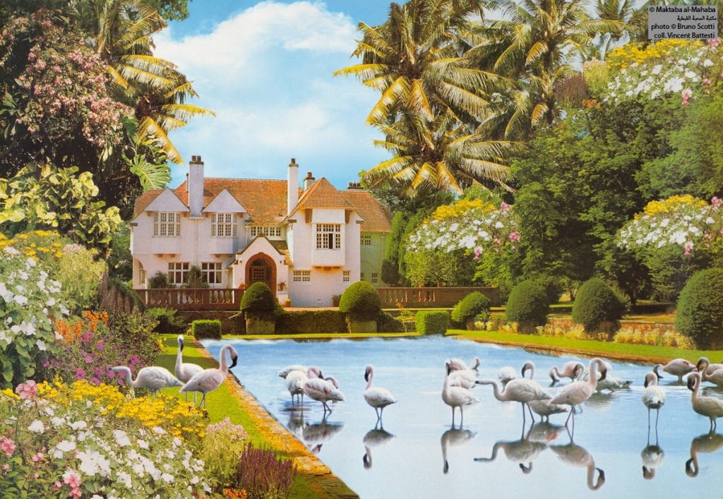 Ces posters créent un espace de nature exotique, s’étirant entre la nostalgie d’un Éden perdu et la promesse du Paradis. Ces visions se nourrissent d’une accumulation d’images d’autres époques et d’autres temps – grands jardins de l’apogée de l’empire de l’Islam, chalets suisses, villas californiennes, châteaux néo-classiques, pseudo Taj Mahal moghol doré, pagodes et phares atlantiques – le tout trahissant l’attrait d’un monde globalisé.