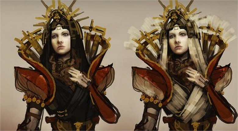 Les visiteurs ont également l’occasion d’assister à la conception de nouveaux héros et créatures comme des chevaliers, extraterrestres, animaux mythologiques… les fameux Lapins Crétins… L’Hommage au 7e Art’ permet d’établir une liaison entre le cinéma et le jeu vidéo: études de décor et de lumière qui n’ont rien à envier aux films noirs, scènes d’action hollywoodiennes, acteurs bien connus (Ellen Paye, Willem Dafoe) venus à Paris pour inspirer les créateurs. Le côté magie, poésie et féerie est reflété dans les très belles aquarelles des fées et elfes de forêt, des décors fabuleux, des châteaux mais aussi dans l’installation-tableau d’une princesse ‘’égarée’’ et orientée par un faisceau lumineux qui s’anime en permanence. Une évasion fascinante dans un univers onirique.